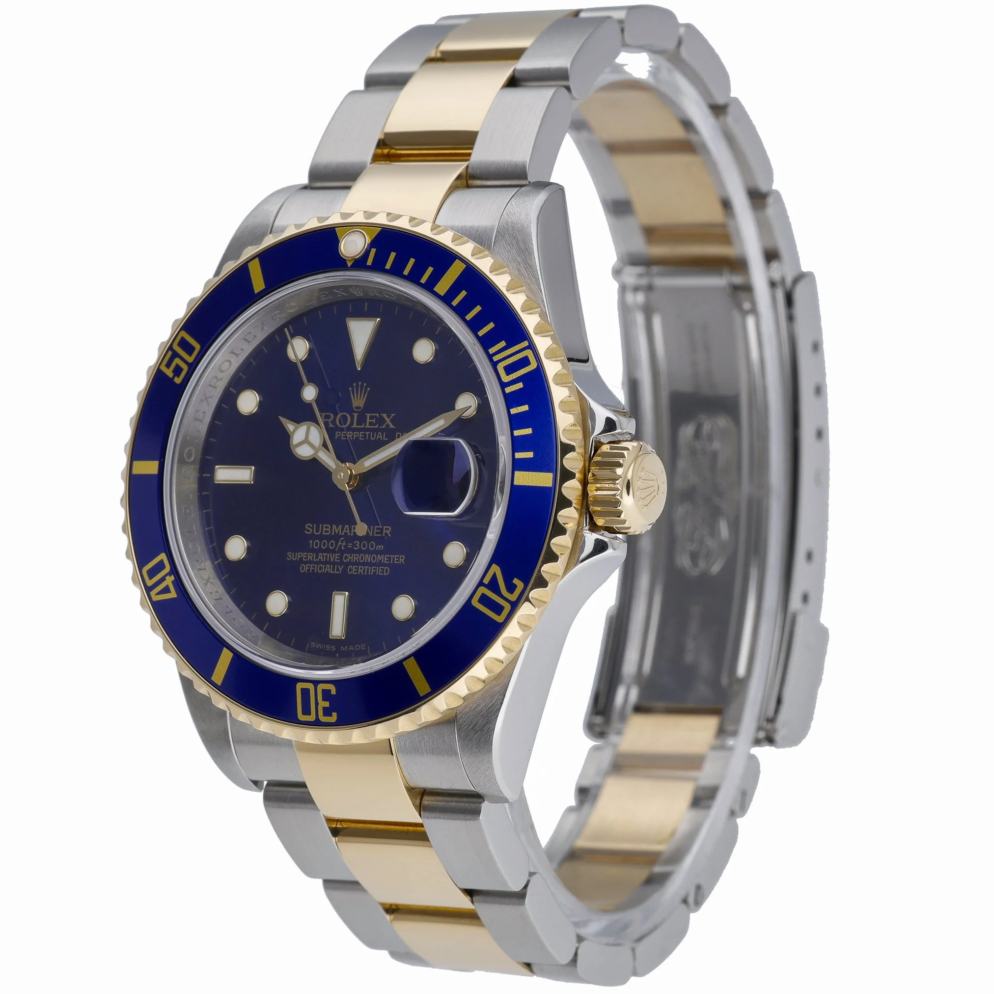 Presenting the Rolex Submariner 16613LB (BQ Ref 53177), an iconic 40mm diver in steel and yellow gold with a vibrant blue dial and sapphire crystal. Powered by a reliable automatic movement, it features a unidirectional rotatable bezel, 300M water resistance, and the classic Oyster bracelet secured by an Oysterlock clasp. This 2008 gents model is offered in excellent condition and is complete with Rolex box, original papers, and the green tag. Enjoy peace of mind with a 2 Year Warranty and a 14 Day Return Policy, plus the convenience of Prompt Delivery. A timeless blend of luxury and performance, the Submariner 16613LB remains a benchmark for precision and style.