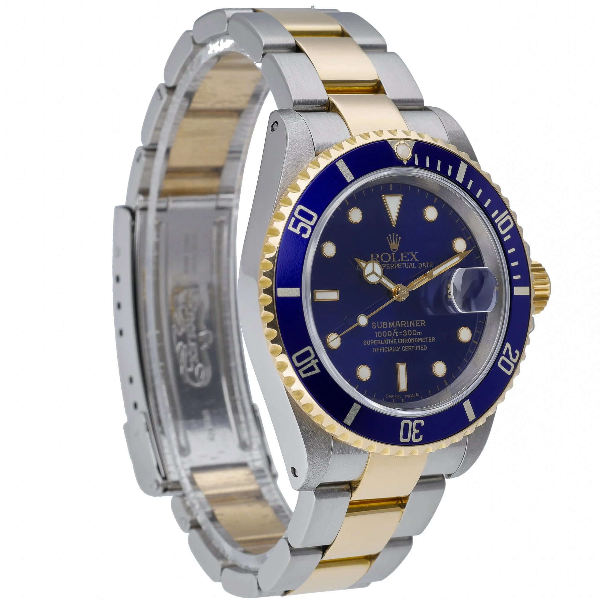 Rolex Submariner 16613LB (BQ Ref 52429), year 2000, in excellent condition. This iconic two-tone Submariner pairs a 40mm steel and yellow-gold case with a striking blue dial under sapphire crystal, complemented by a unidirectional rotatable bezel for precise timing. Powered by an automatic movement and water-resistant to 300m, it’s built for performance and everyday wear. The steel and yellow-gold Oyster bracelet with secure Oysterlock clasp delivers comfort and durability. Supplied with Rolex box and green tag, this classic gents diver is ready to wear and enjoy. Includes a 2-year warranty, next day delivery, and a 14-day return policy. Model: Submariner | Ref: 16613LB | Case size: 40mm | Movement: Automatic | Dial: Blue | Bracelet: Oyster (steel & yellow gold).
