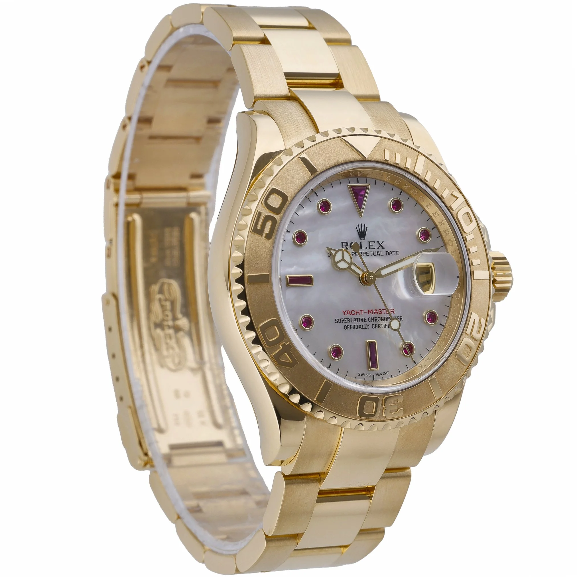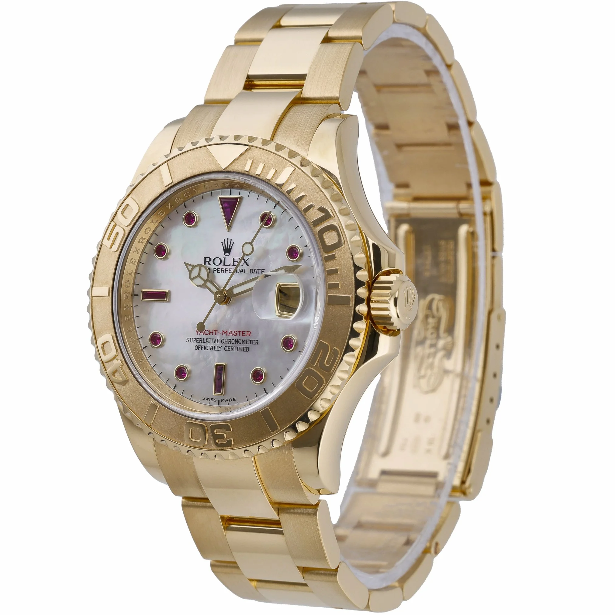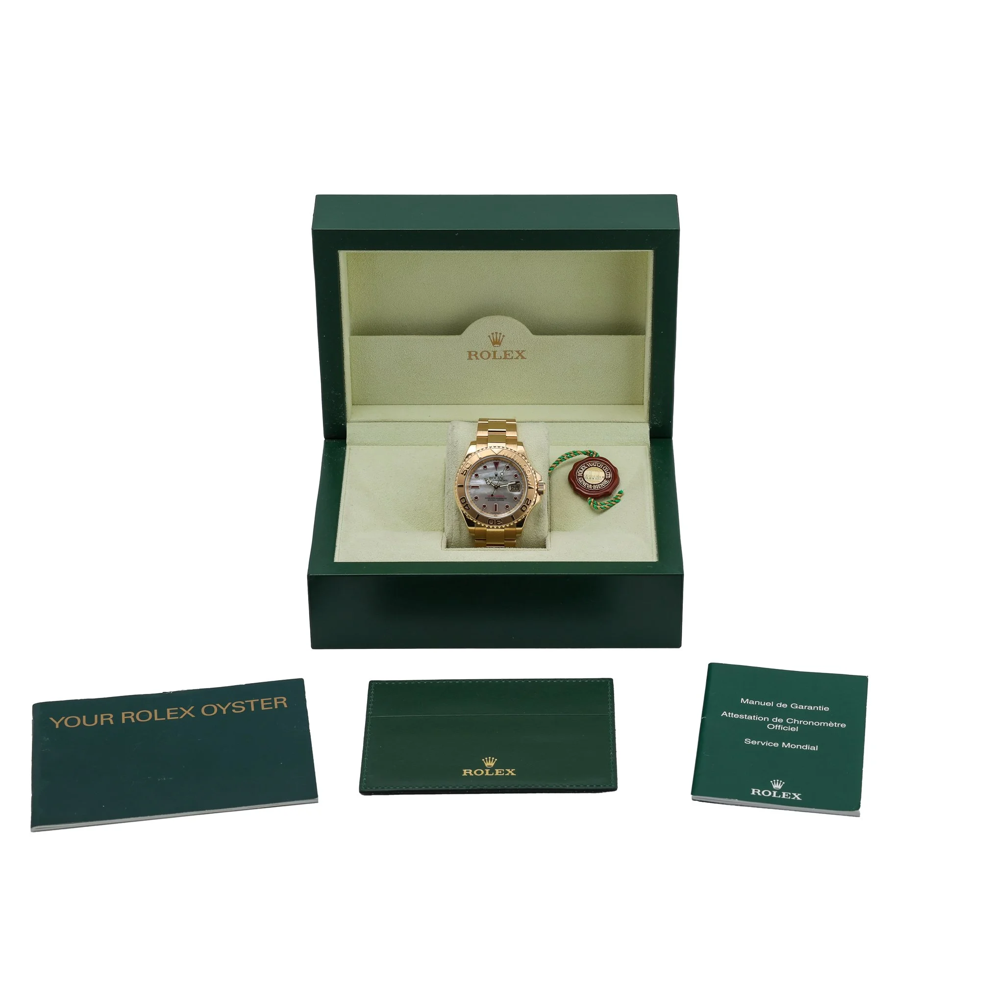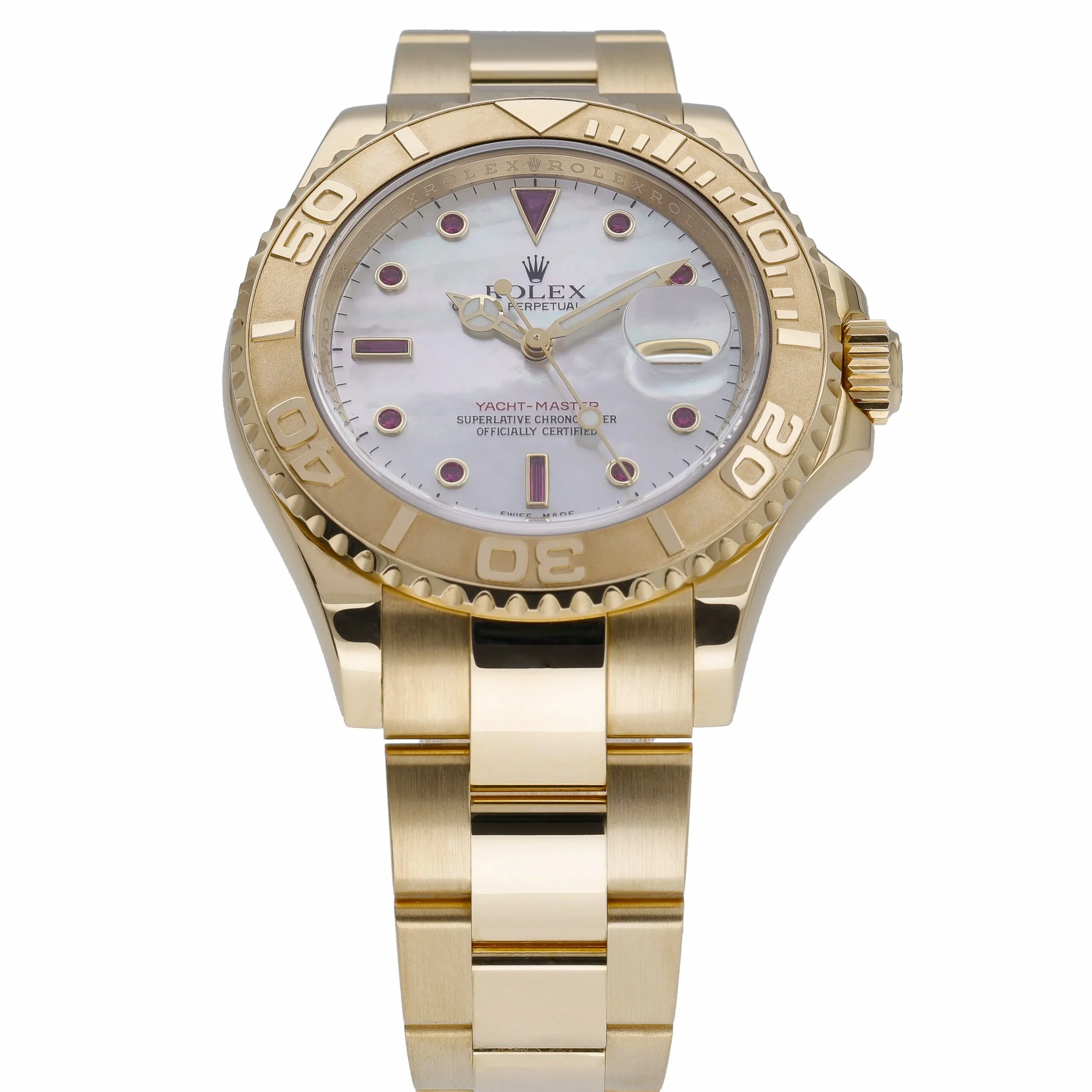 Elevate your collection with this Rolex Yacht-Master 40 (Model 16628), crafted in solid 18ct Yellow Gold with a matching Oyster bracelet and secure Oysterlock clasp. The 40mm case, capped by scratch-resistant sapphire crystal and a bidirectional rotatable bezel, frames a lustrous mother-of-pearl dial enhanced with ruby and diamond-set hour markers. Powered by an automatic movement and water-resistant to 100M, this 2008 example blends nautical utility with refined luxury. Presented in excellent condition, it is supplied with box and green tag, and includes a 2 Year Warranty, 14 Day Return Policy, and Prompt Delivery for your convenience. BQ Ref: 52983.
