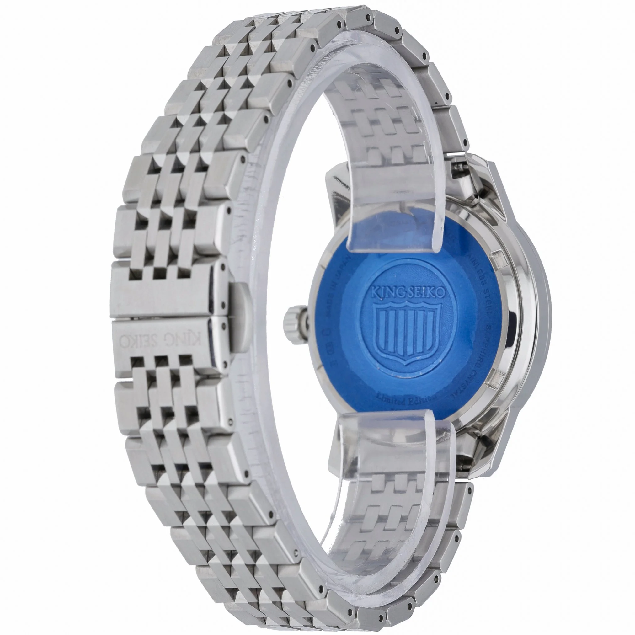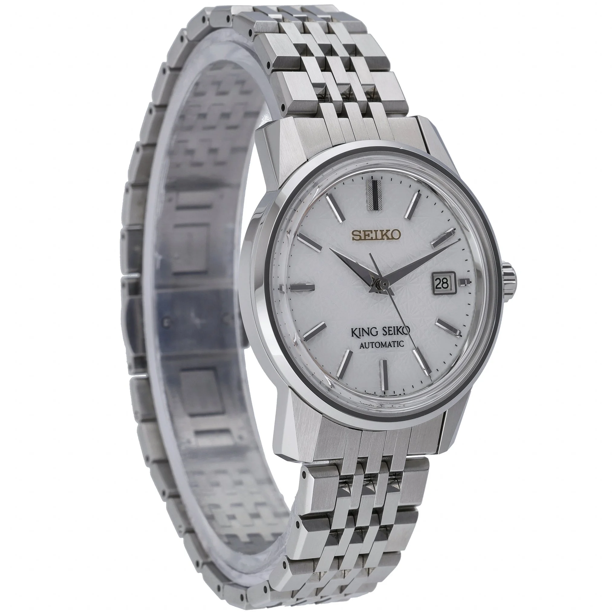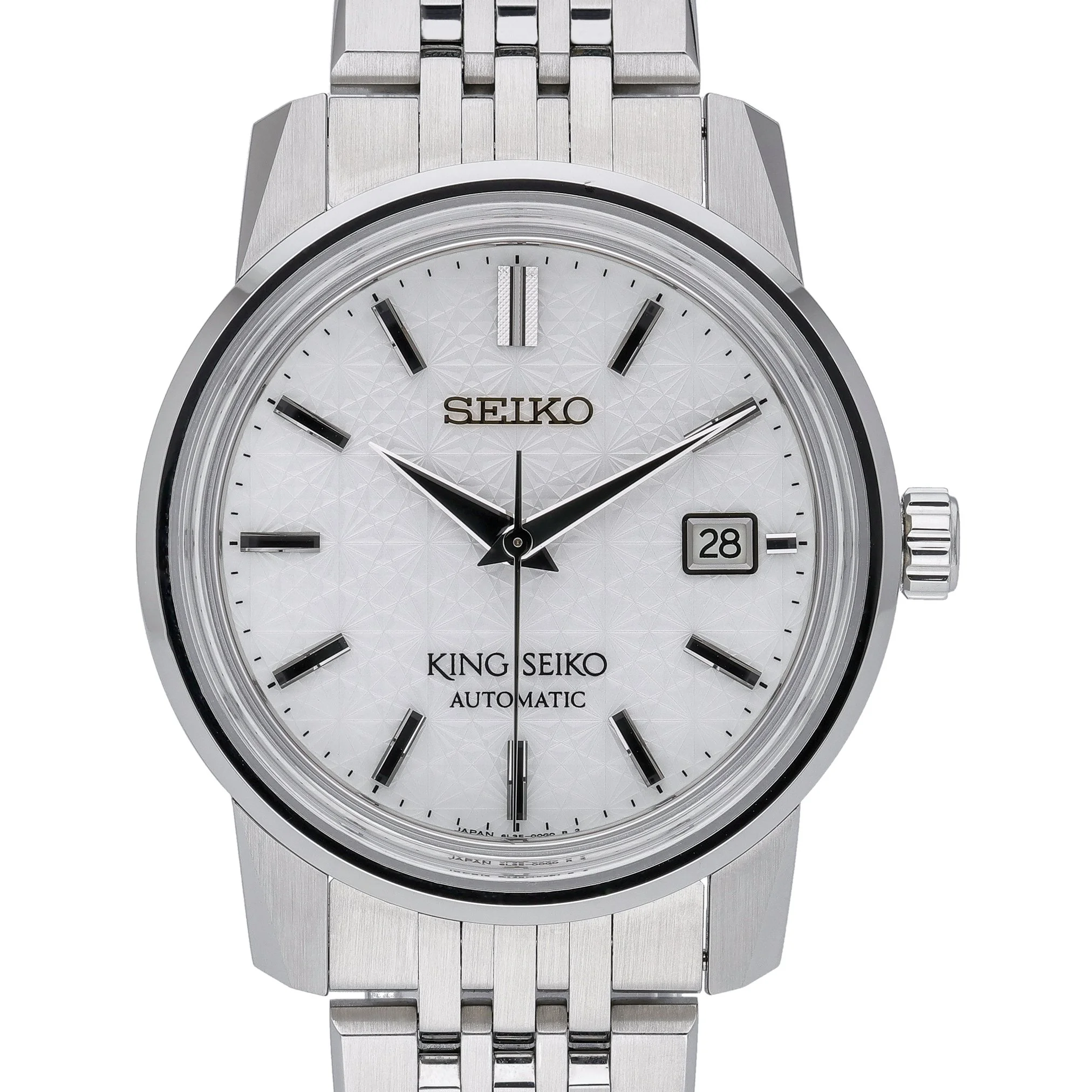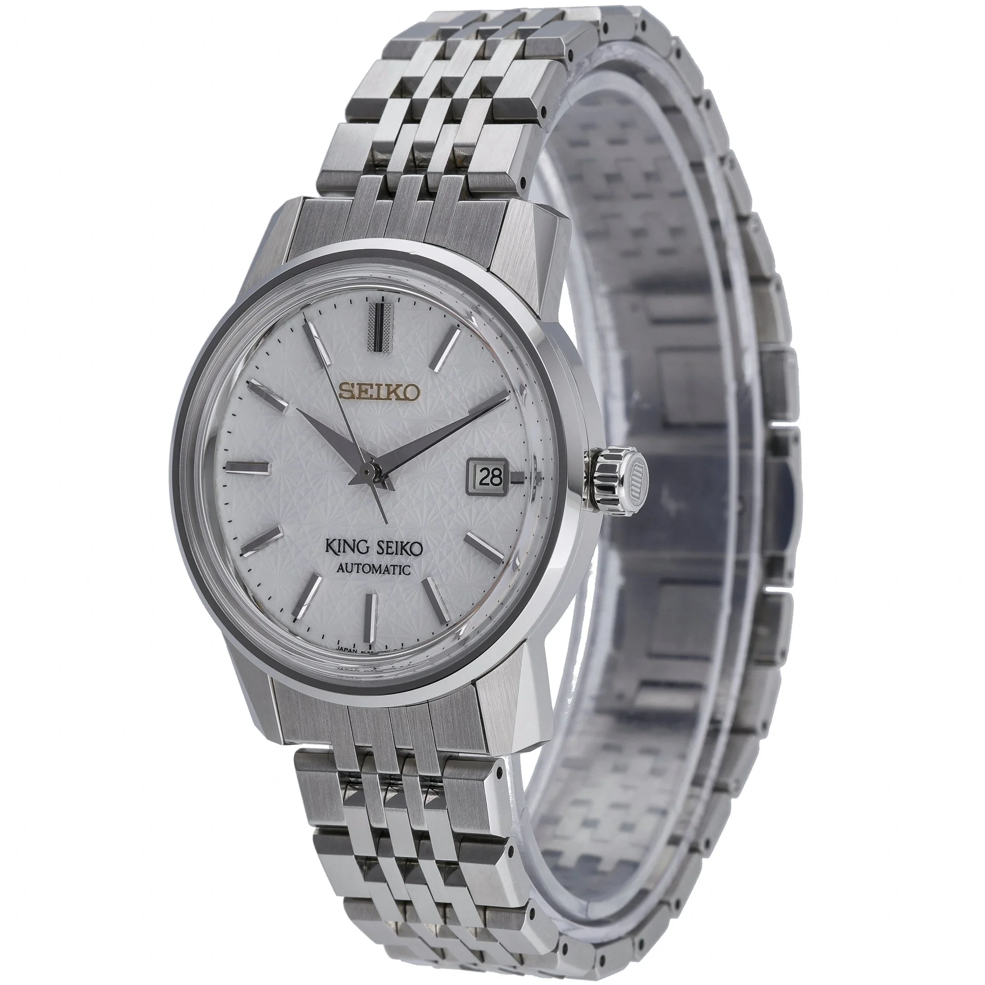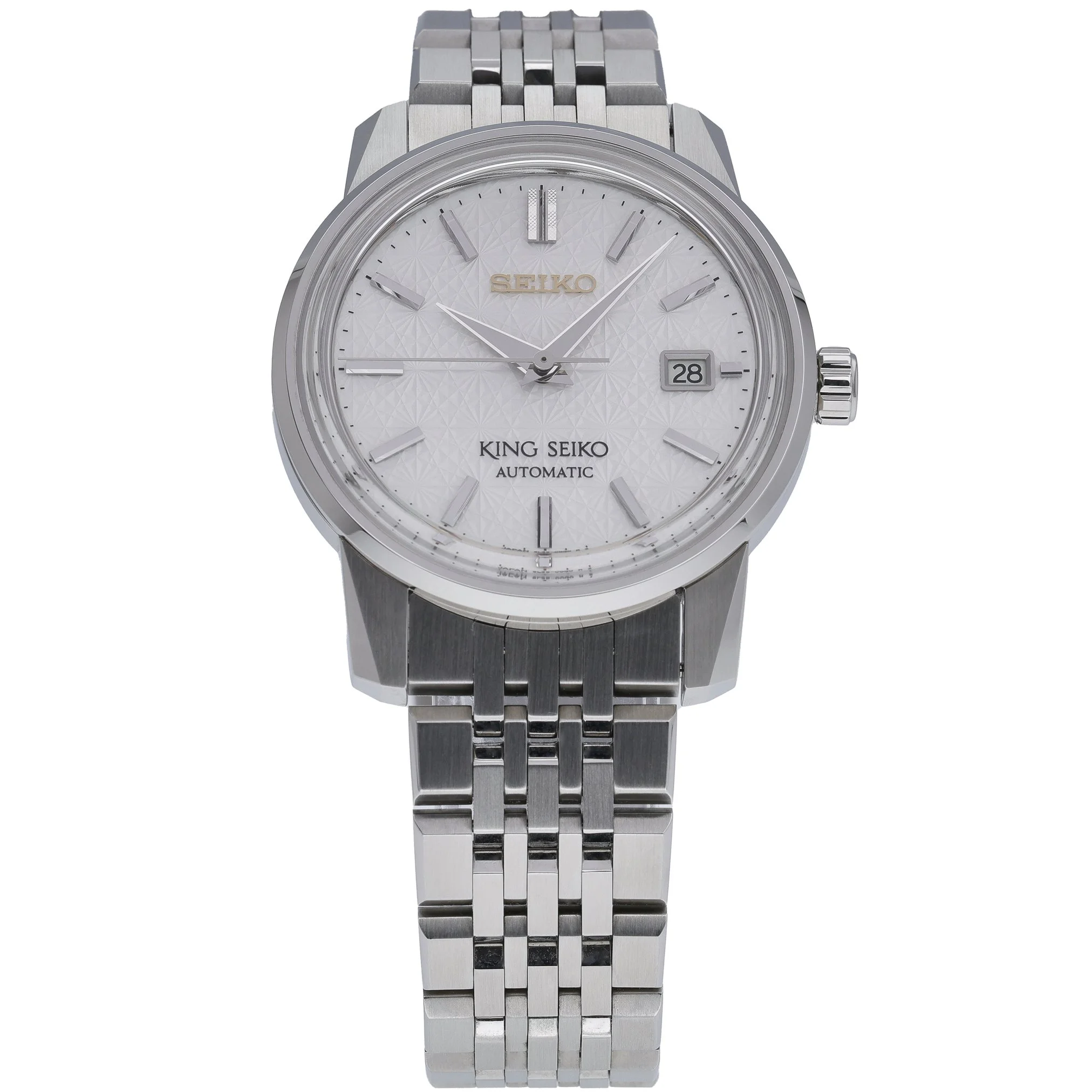 Discover the Seiko King Seiko SJE095J1—an elegant 38mm gents’ timepiece that blends refined design with everyday practicality. Crafted in stainless steel, it features a clean silver dial with baton markers, a plain bezel, and a robust steel bracelet with a secure folding clasp. The automatic movement sits beneath a scratch-resistant sapphire crystal, and 50M water resistance provides confidence for daily wear. This 2024 model is in excellent condition and comes complete with its original box and papers. Enjoy added assurance with a 2 Year Warranty, a 14 Day Return Policy, and Prompt Delivery. BQ Ref: 53165.