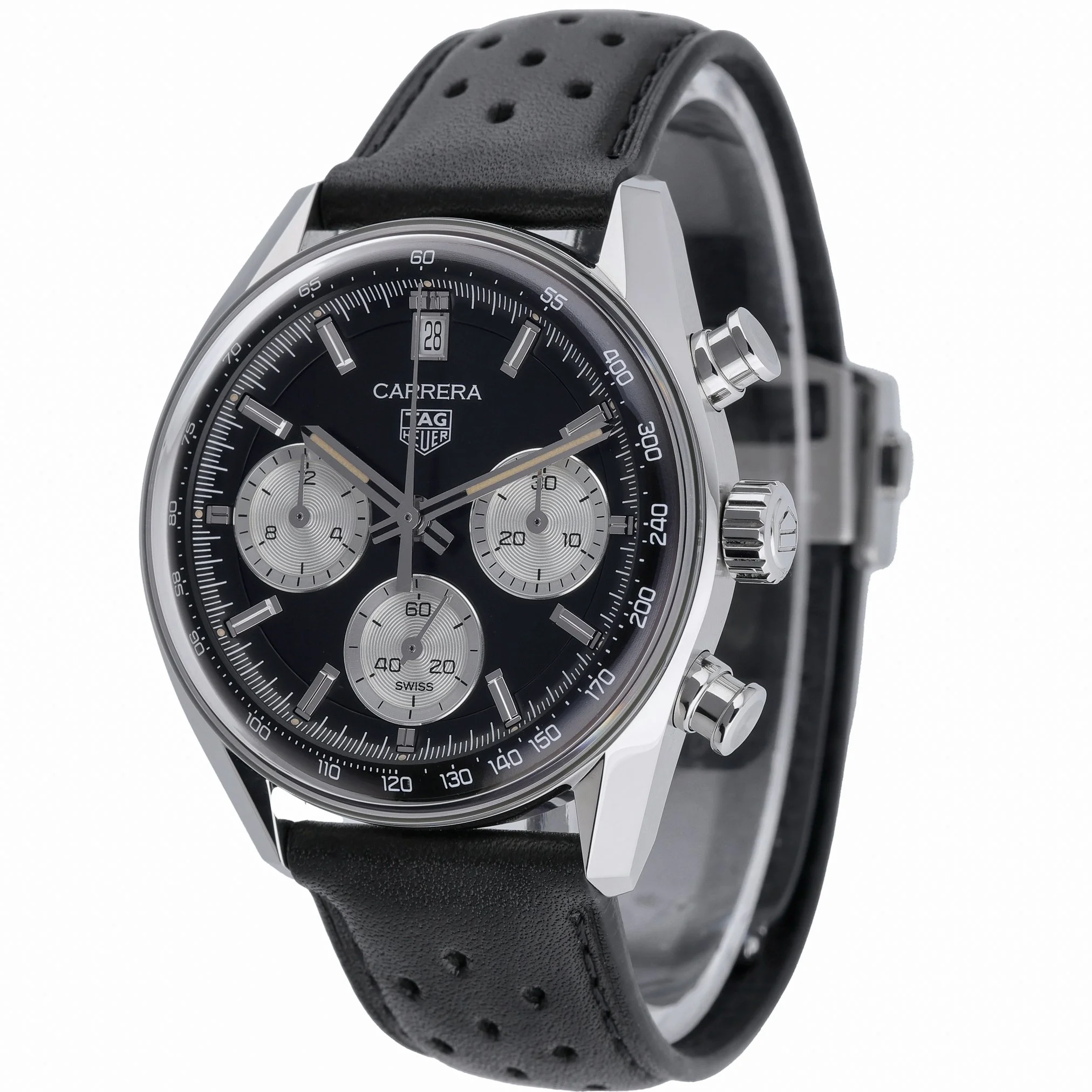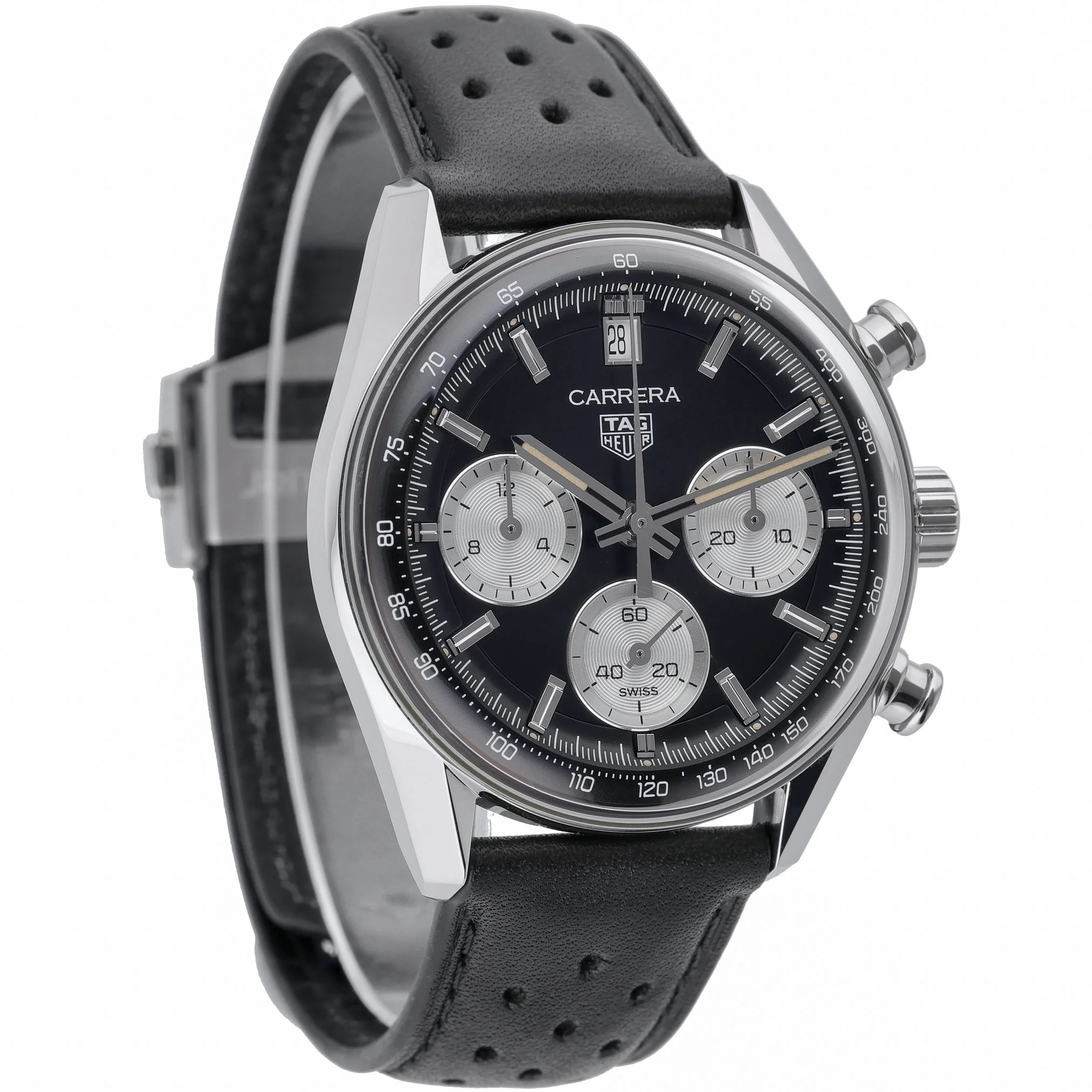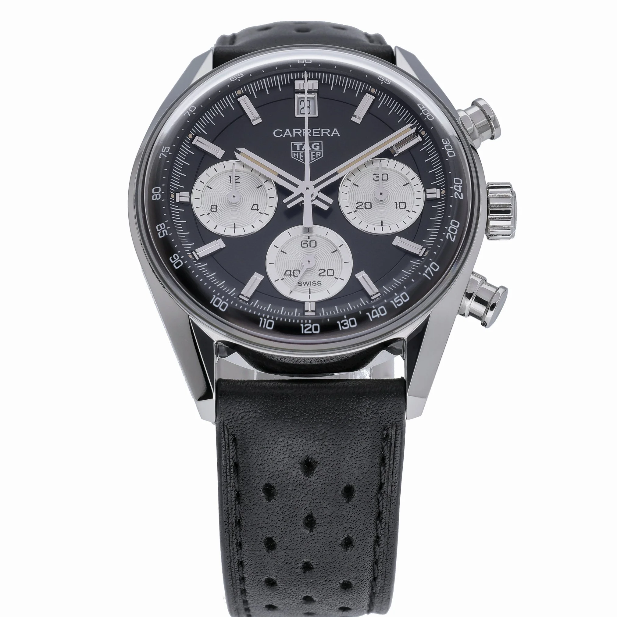 The TAG Heuer Carrera Chronograph (Model CBS2210-0) pairs modern performance with timeless style. Featuring a 39mm stainless steel case, black chronograph dial, and plain bezel under a scratch‑resistant sapphire crystal, it’s powered by an automatic movement for precision you can rely on. Water resistant to 100M, this 2025 gents model is presented on a supple leather bracelet with a secure folding clasp. In excellent condition, it comes complete with its original box and papers, plus a 2-year warranty for added peace of mind. A refined all‑rounder that transitions effortlessly from desk to weekend. BQ Ref: 53215. Enjoy next day delivery and a 14-day return policy.