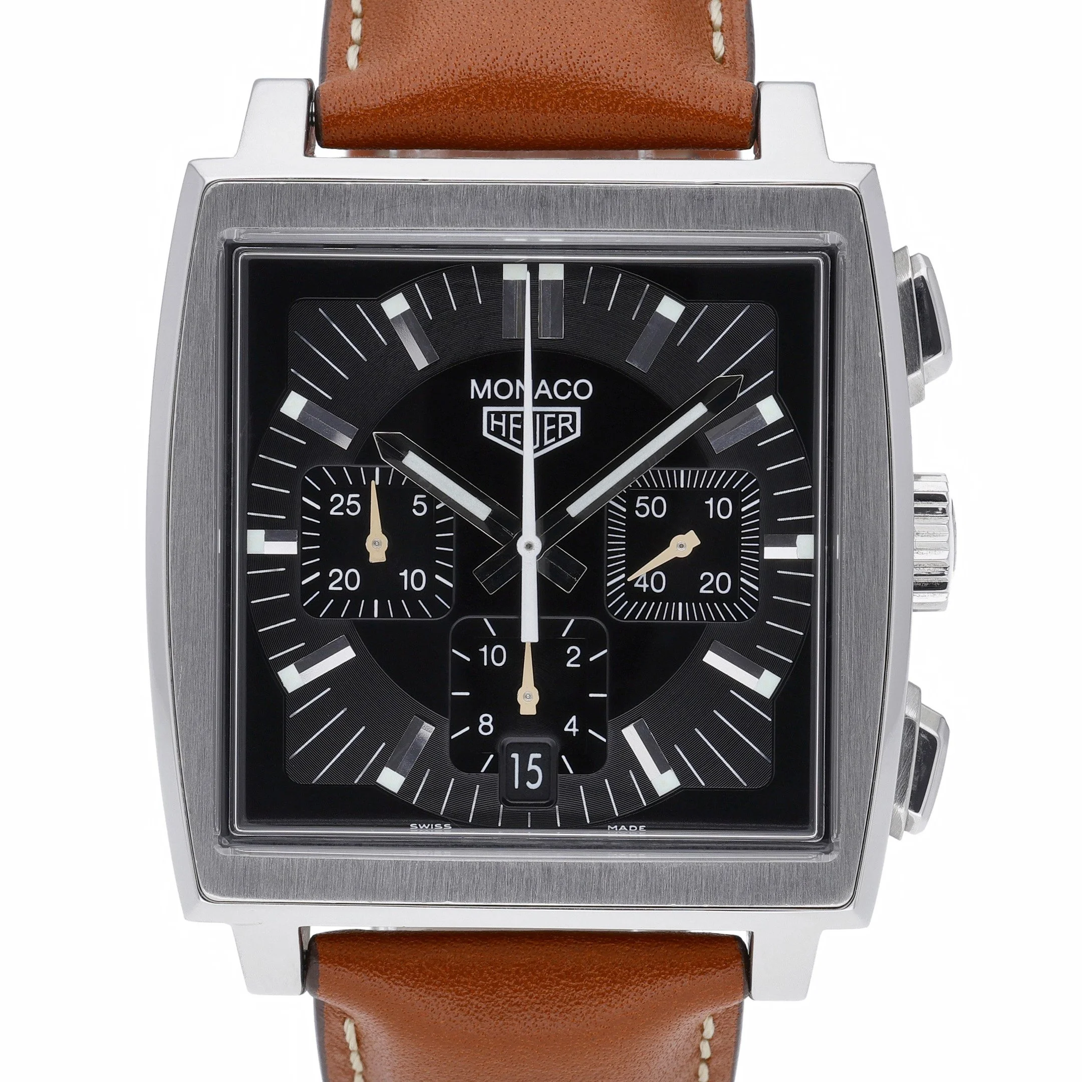 An enduring motorsport icon, this TAG Heuer Monaco (BQ Ref 51619) features a 38mm stainless steel case with a smooth bezel and a black chronograph dial under Plexi glass. Powered by an automatic movement, it is paired with a leather bracelet secured by a folding clasp and offers water resistance to 3 ATM. Manufactured in 2000 and presented in good condition, this gents’ timepiece is supplied with its original box and papers. Enjoy peace of mind with our 2 Year Warranty, plus Prompt Delivery and a 14 Day Return Policy.