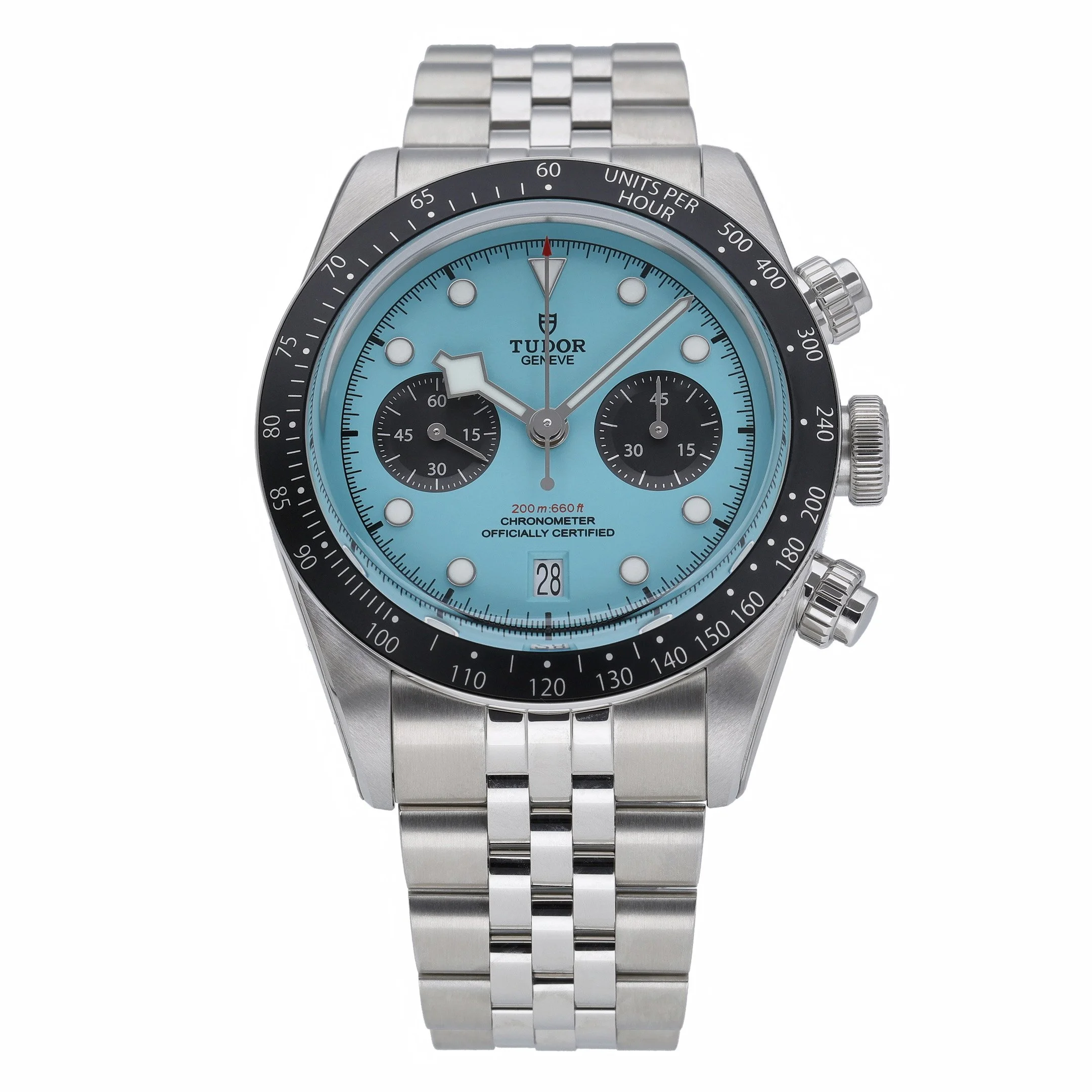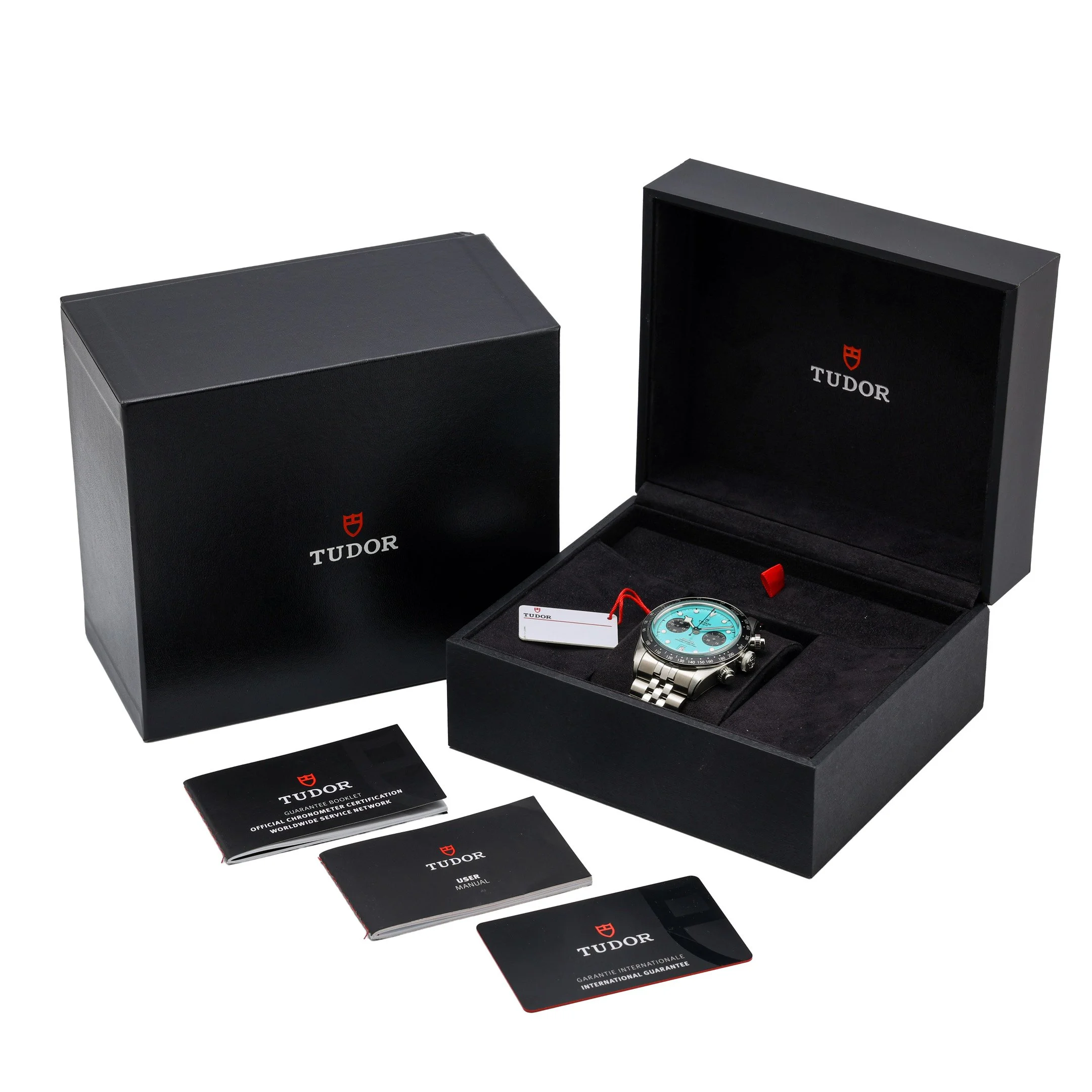Experience the TUDOR Black Bay Chrono (Model 79360N), a 41mm stainless steel timepiece that fuses dive-ready resilience with racing heritage. Its striking turquoise chronograph dial sits beneath a scratch-resistant sapphire crystal, encircled by a tachymetric scale bezel for precise speed measurements. Driven by a robust automatic movement and water resistant to 200 m, it comes on a solid steel bracelet with a secure folding clasp. This 2026 example is New/Unworn with factory stickers and is complete with box, original papers, and the original white tag. Covered by a 5-year manufacturer’s warranty from the 2026 date of manufacture. BQ Ref: 53384. Enjoy fast, insured next day delivery and a 14-day return policy for added confidence.