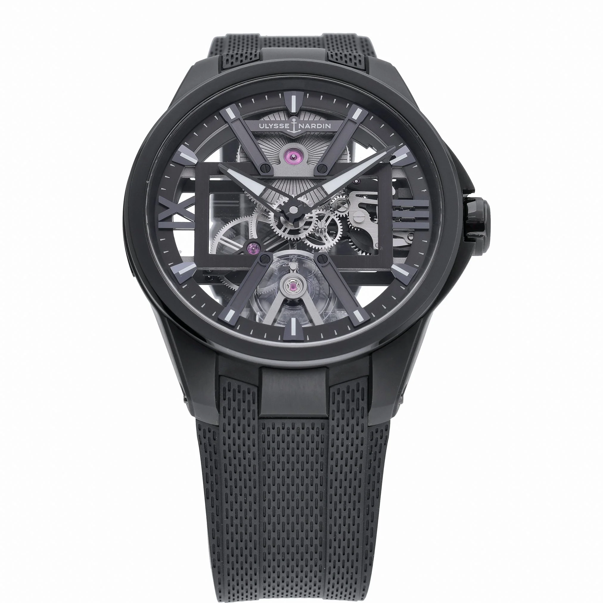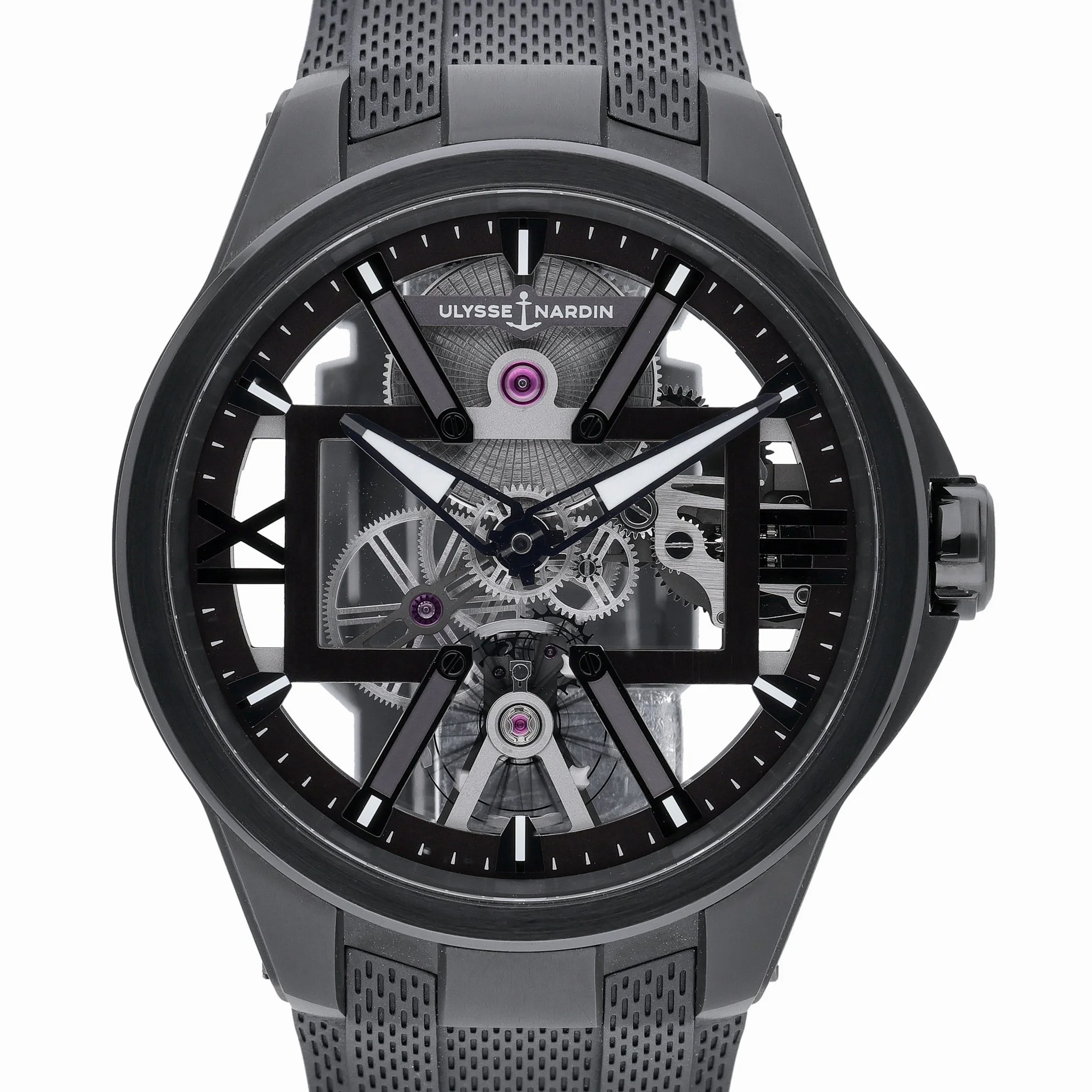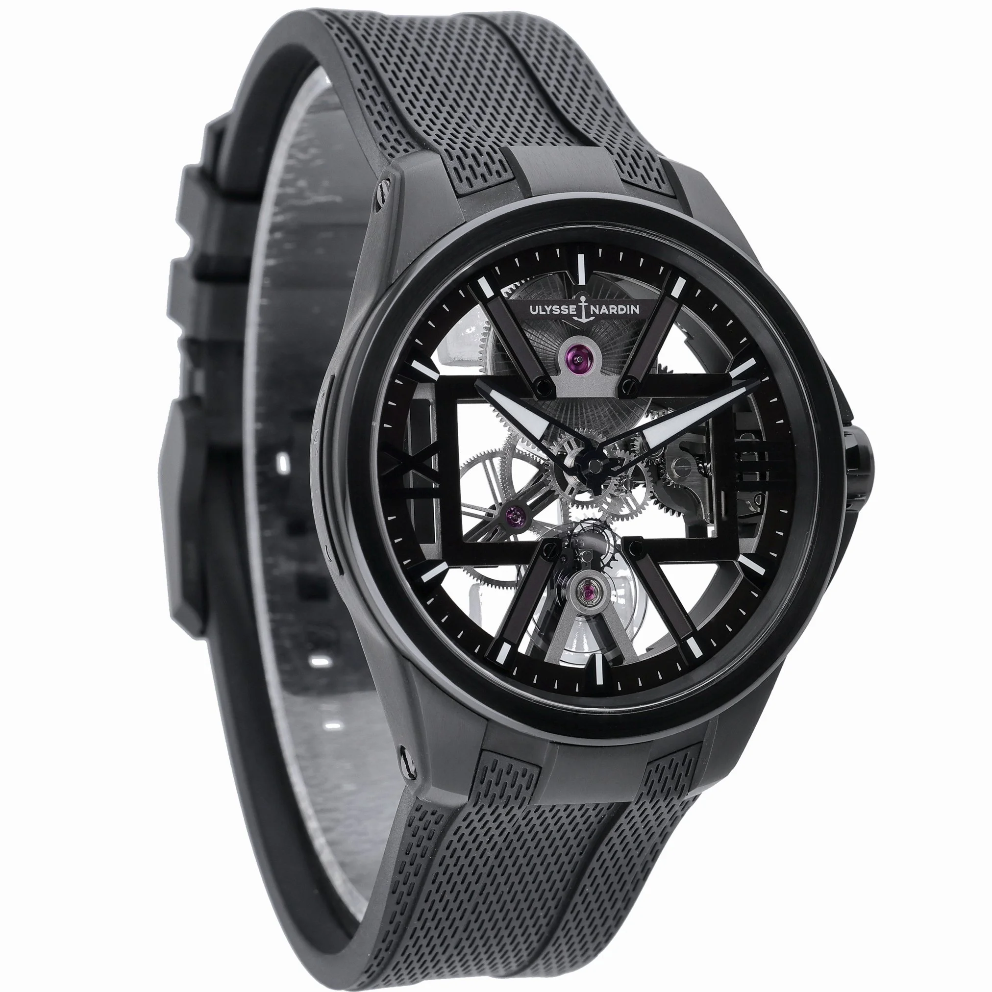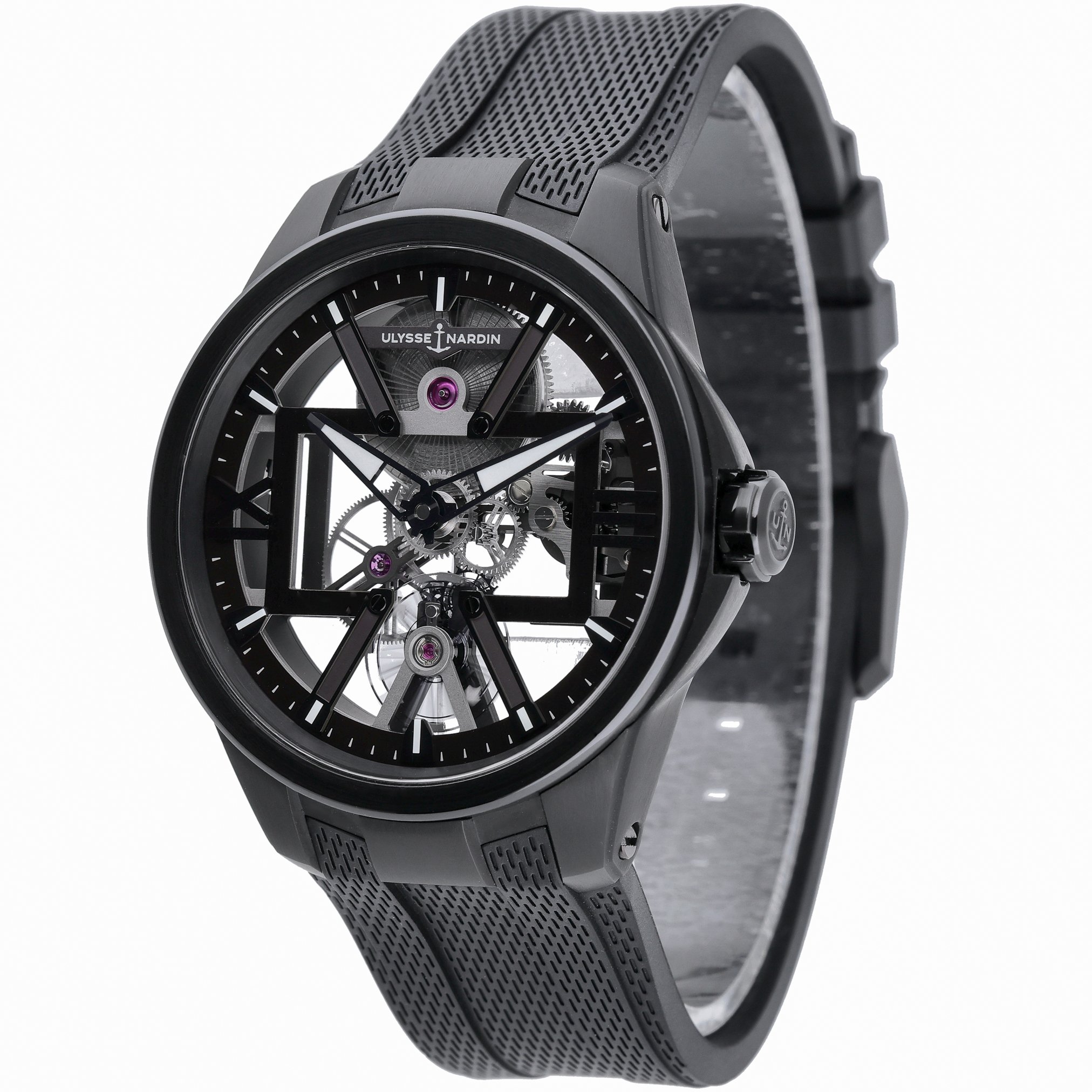 Experience avant‑garde watchmaking with the Ulysse Nardin Skeleton X, model 3713-260/BLACK. Its 42mm titanium case and plain bezel frame a striking skeleton dial under sapphire crystal, revealing the intricacy of its manual-wind movement. Lightweight yet robust, it’s paired with a black rubber strap and pin buckle for contemporary comfort, and offers 50M water resistance for everyday versatility. This 2022 example is in excellent condition and is supplied with its original box and papers. Enjoy added peace of mind with our 2 Year Warranty and 14 Day Return Policy, plus Prompt Delivery for swift service. A bold statement of modern horology, ready for the wrist. BQ Ref: 53276.
