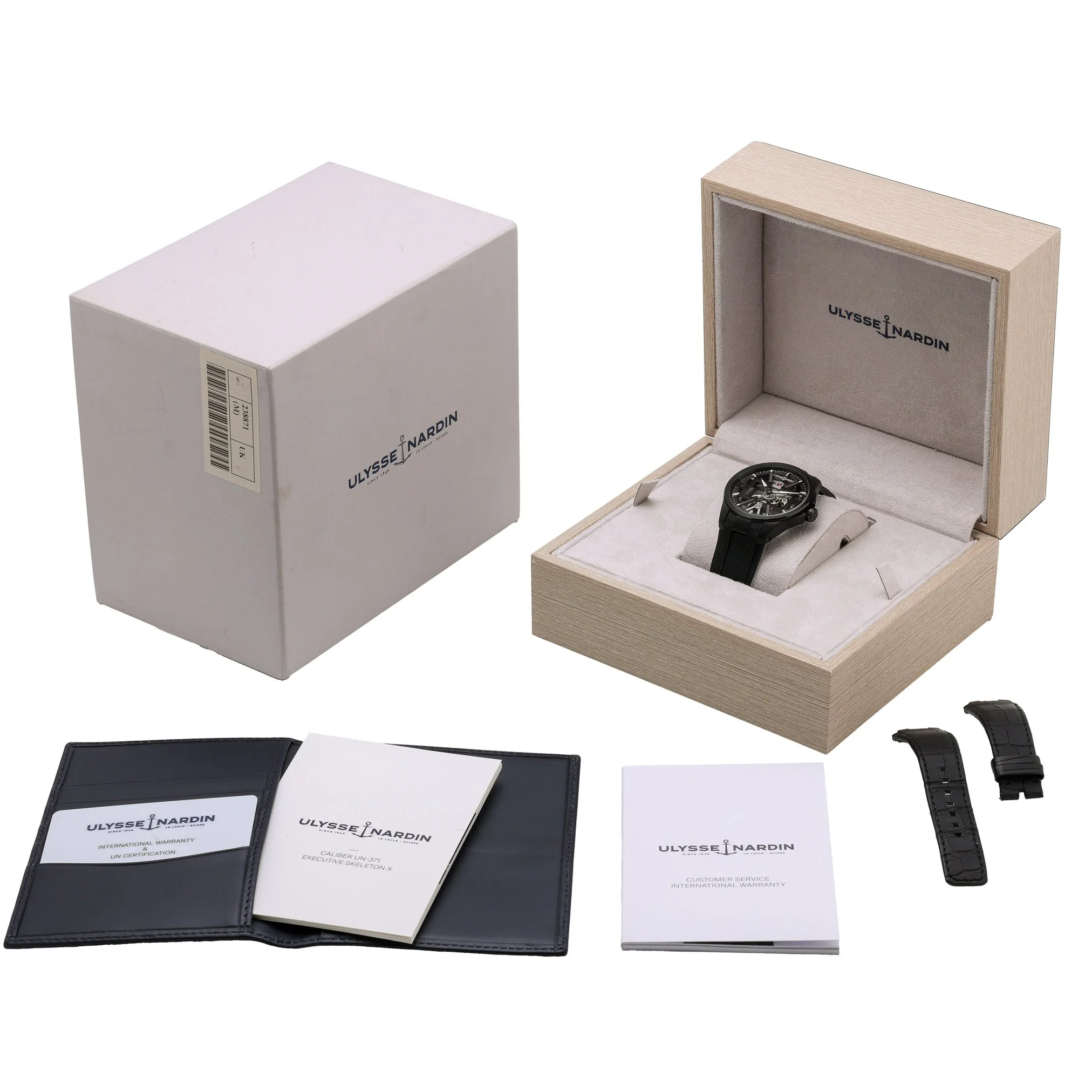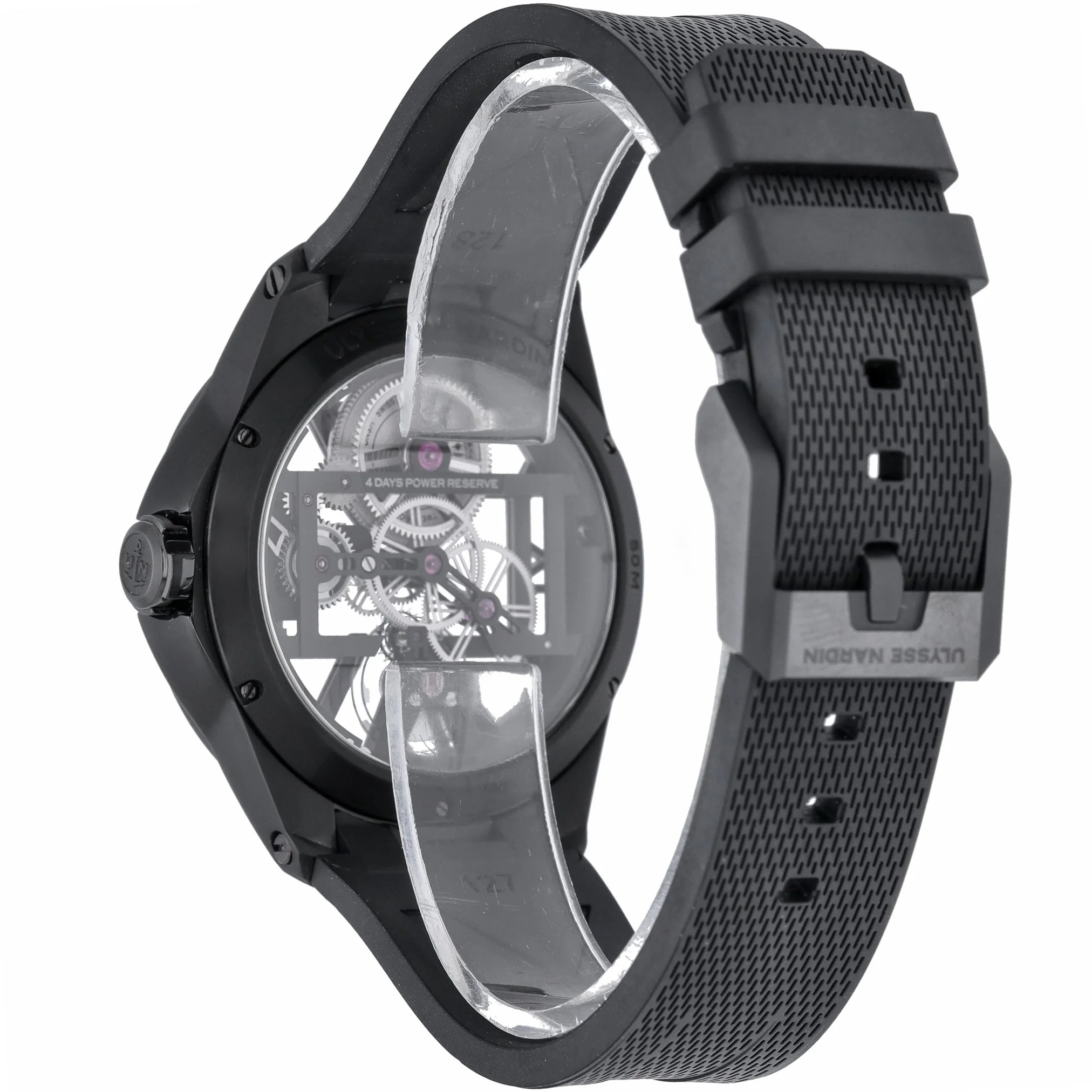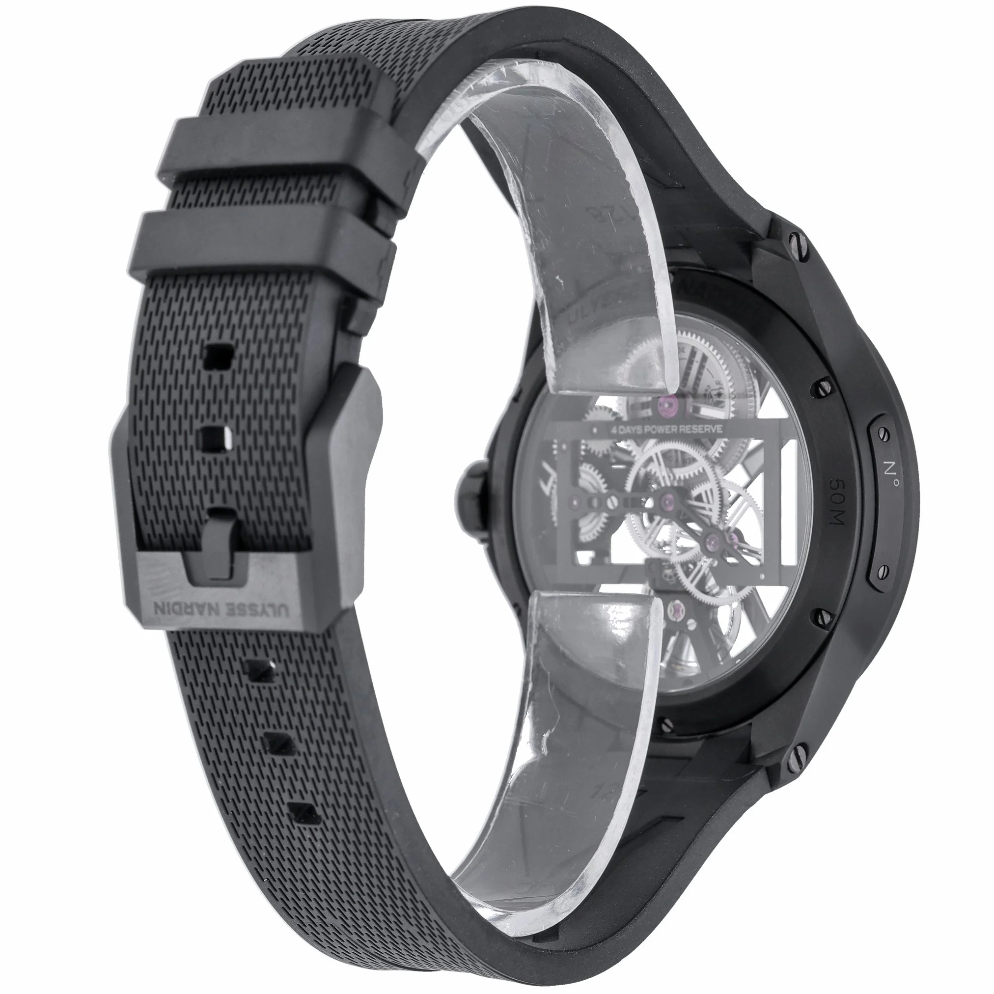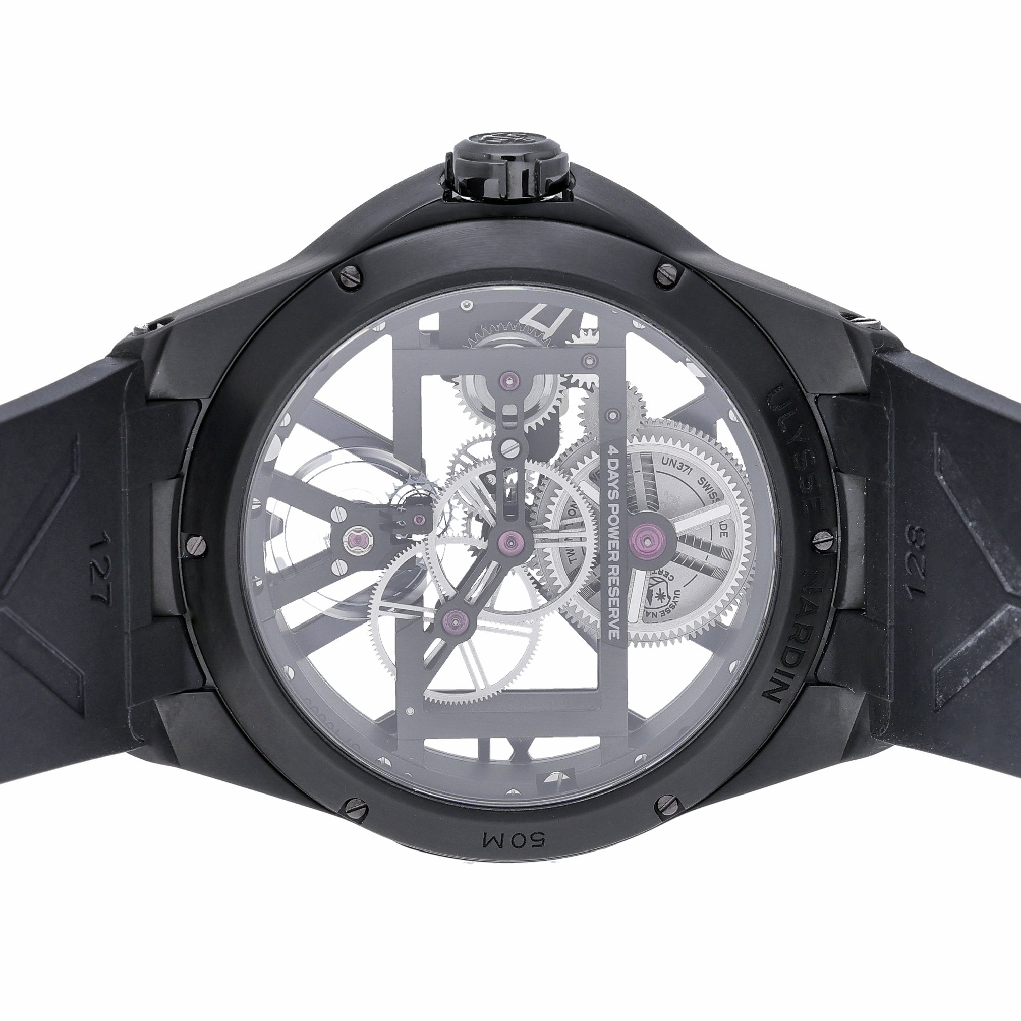 Experience avant‑garde watchmaking with the Ulysse Nardin Skeleton X, model 3713-260/BLACK. Its 42mm titanium case and plain bezel frame a striking skeleton dial under sapphire crystal, revealing the intricacy of its manual-wind movement. Lightweight yet robust, it’s paired with a black rubber strap and pin buckle for contemporary comfort, and offers 50M water resistance for everyday versatility. This 2022 example is in excellent condition and is supplied with its original box and papers. Enjoy added peace of mind with our 2 Year Warranty and 14 Day Return Policy, plus Prompt Delivery for swift service. A bold statement of modern horology, ready for the wrist. BQ Ref: 53276.
