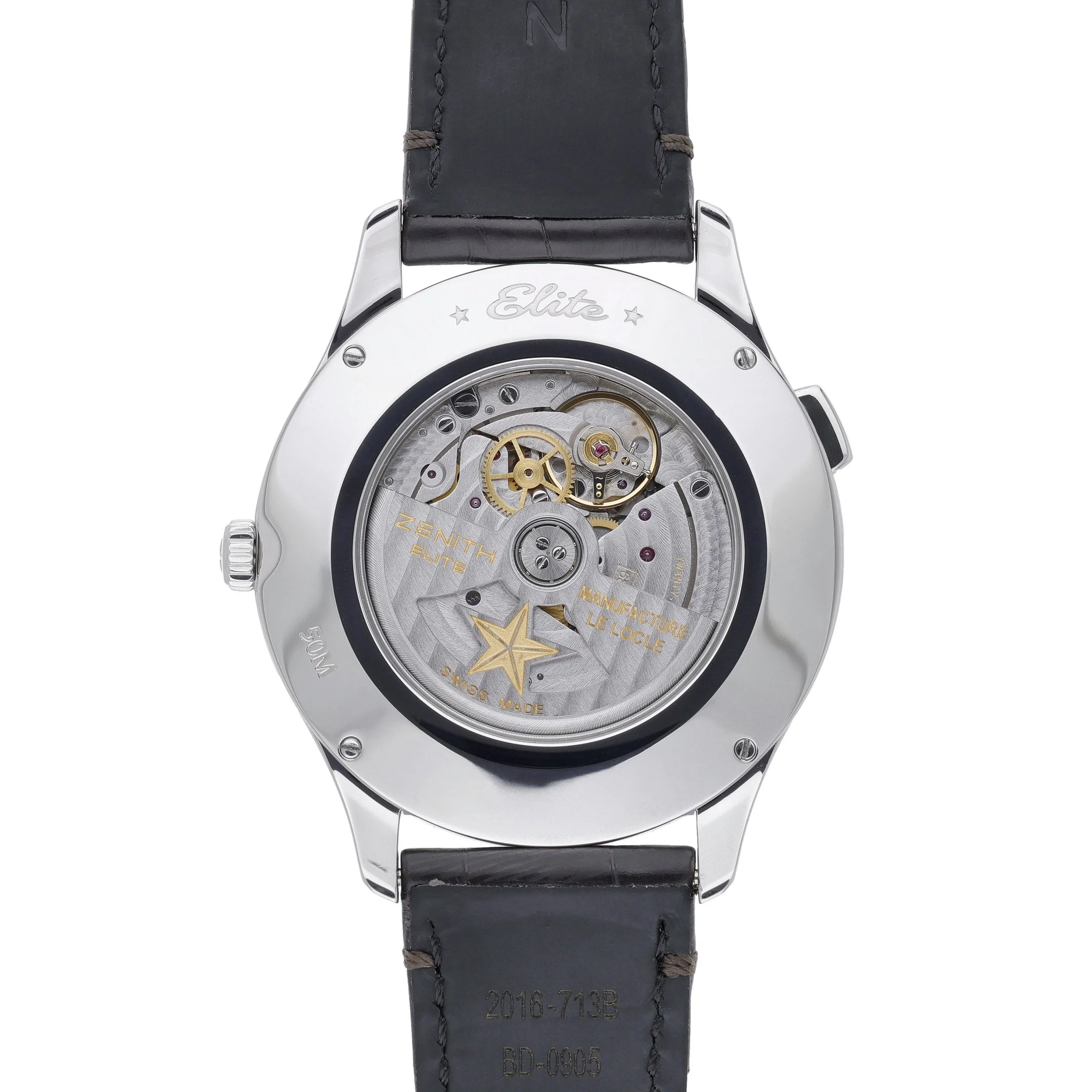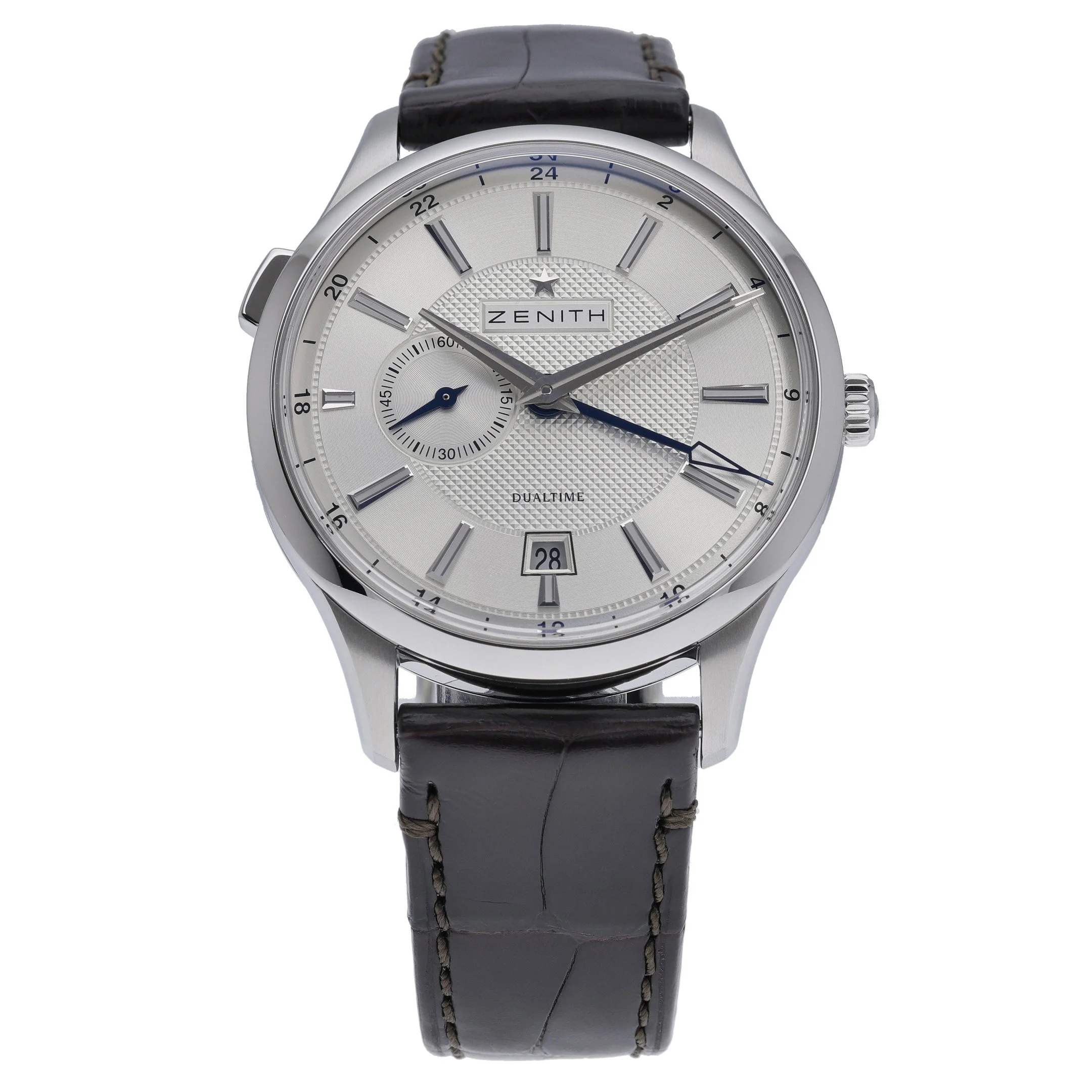 The Zenith Elite Dual Time (BQ Ref 52420) is a refined 41mm gents’ timepiece crafted in stainless steel and powered by a reliable automatic movement. Showcasing a clean silver dial beneath durable sapphire crystal, it delivers clear legibility with convenient dual time functionality for frequent travelers. A plain bezel and leather strap with pin buckle complete its timeless aesthetic. This 2015 example is in excellent condition, water resistant to 5 ATM, and comes supplied with its original box and papers. Covered by our 2 Year Warranty, it also includes Prompt Delivery and a 14 Day Return Policy for complete peace of mind.
